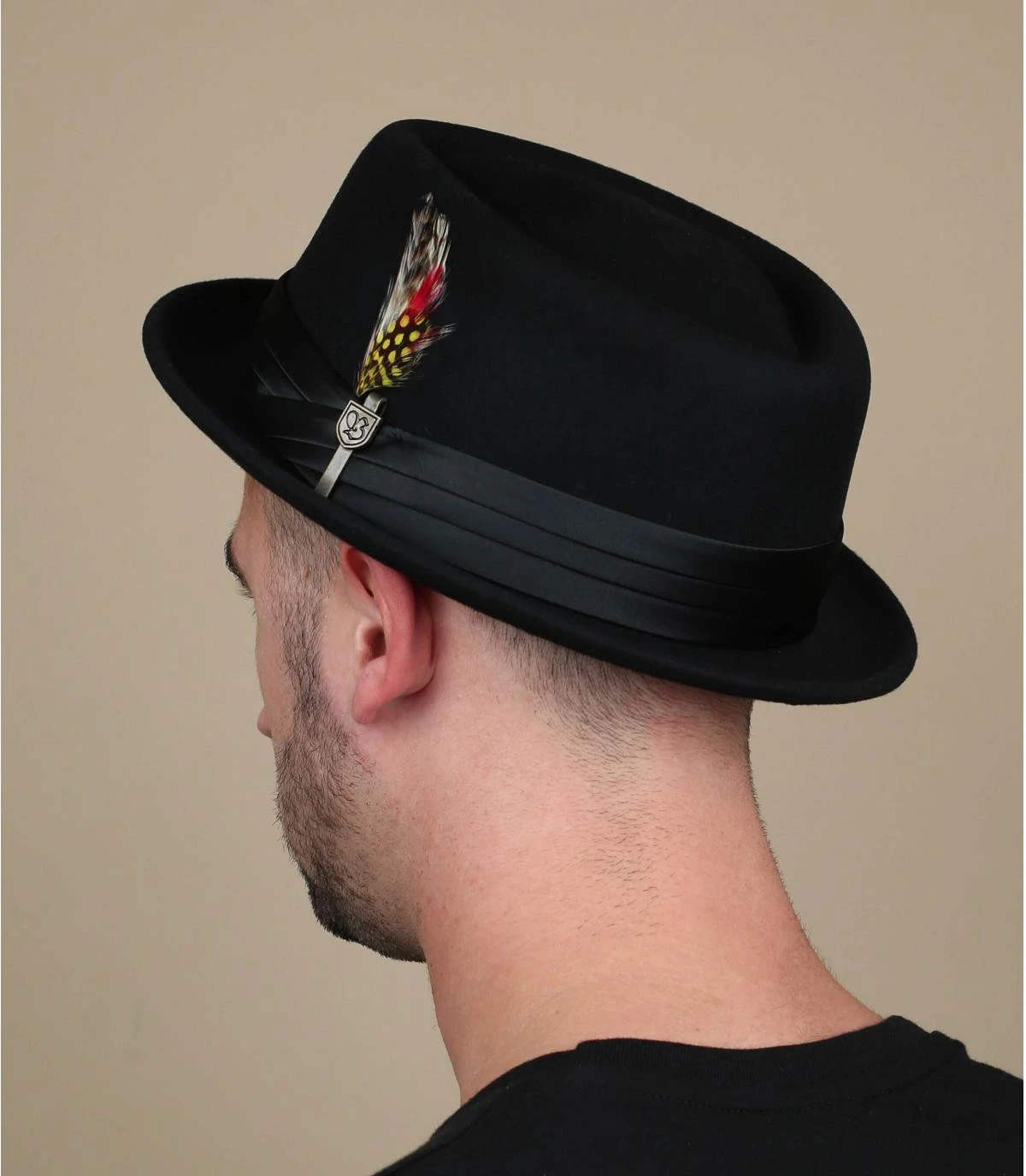 Chapeau en feutre noir plat avec bords légÚrement relevés. Large bandeau triple noir autour de la base et plume, nud et logo Brixton sur le cÎté gauche.