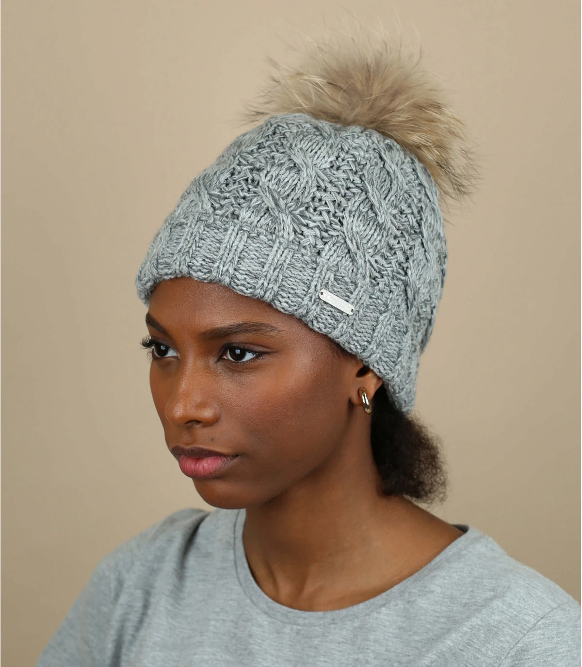 Dans la couleur gris chiné qui fait parler d’elle, ce bonnet confortable donne envie de le mettre dès le premier regard. Les larges torsades, le ravissant pompon en fourrure véritable et la matière très douce sont les coupables.