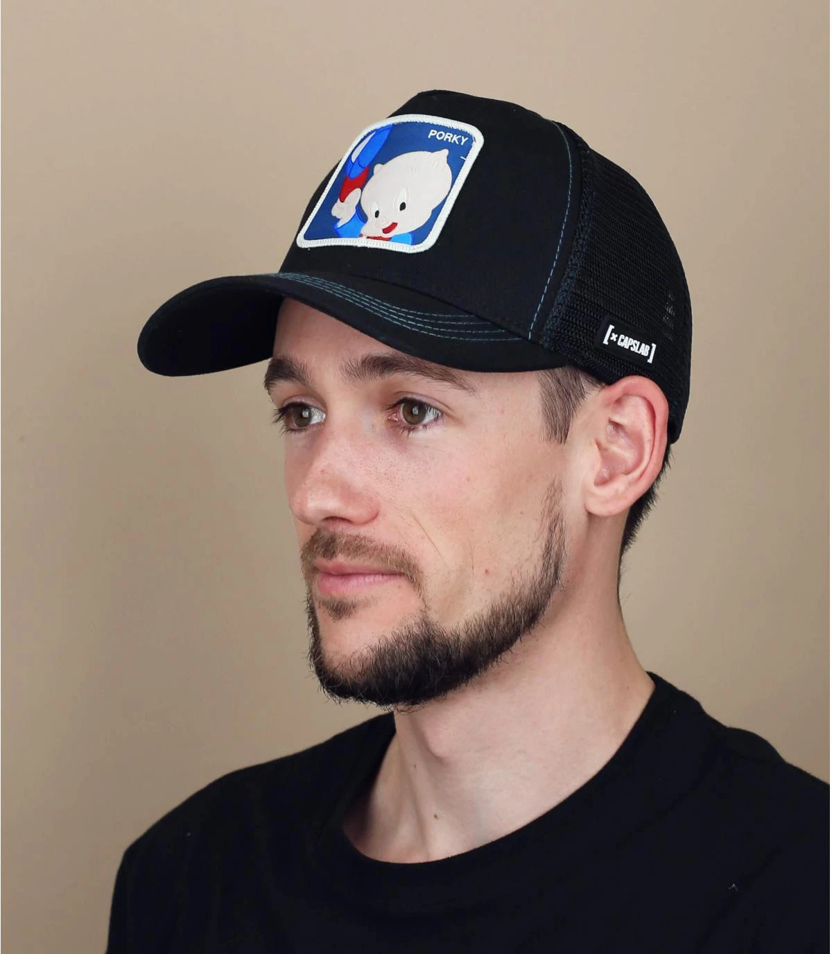 Po-po-po-porky Pig, c’est le pe-pe-pe-personnage le plus sympathique des Lo-lo-loloney Tunes ! Il vous salue gaiement sur le grand patch carré qui décore cette belle casquette trucker que nous propose le spécialiste Capslab.