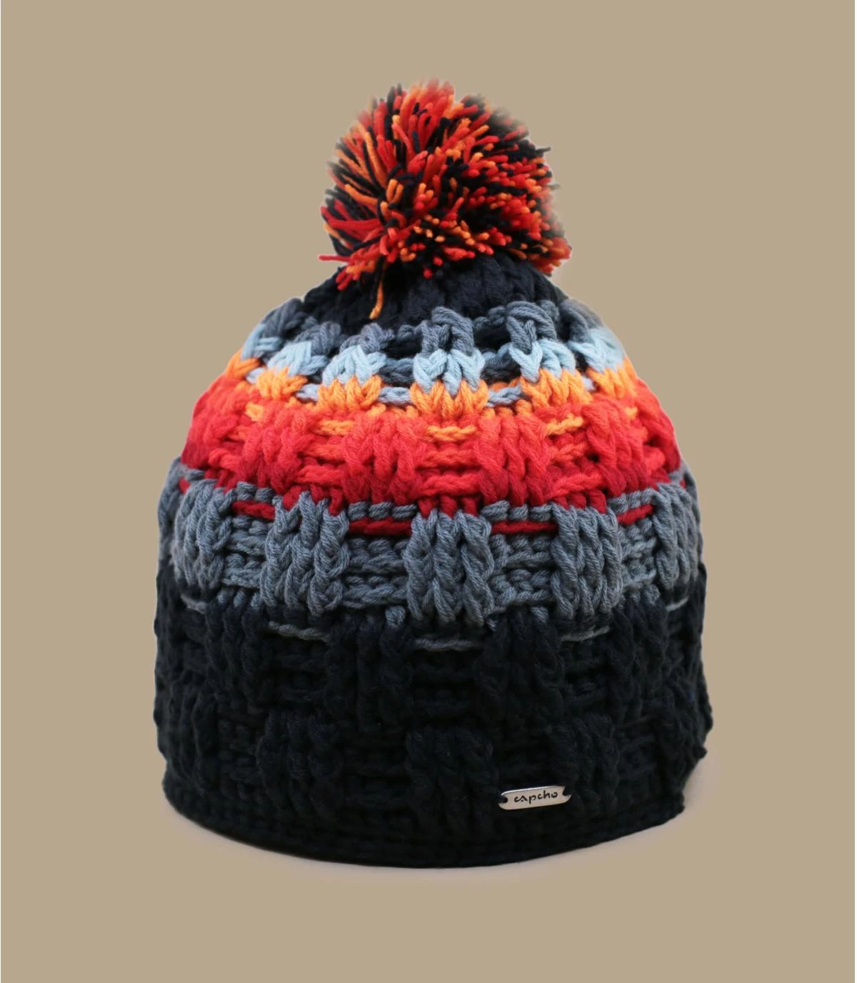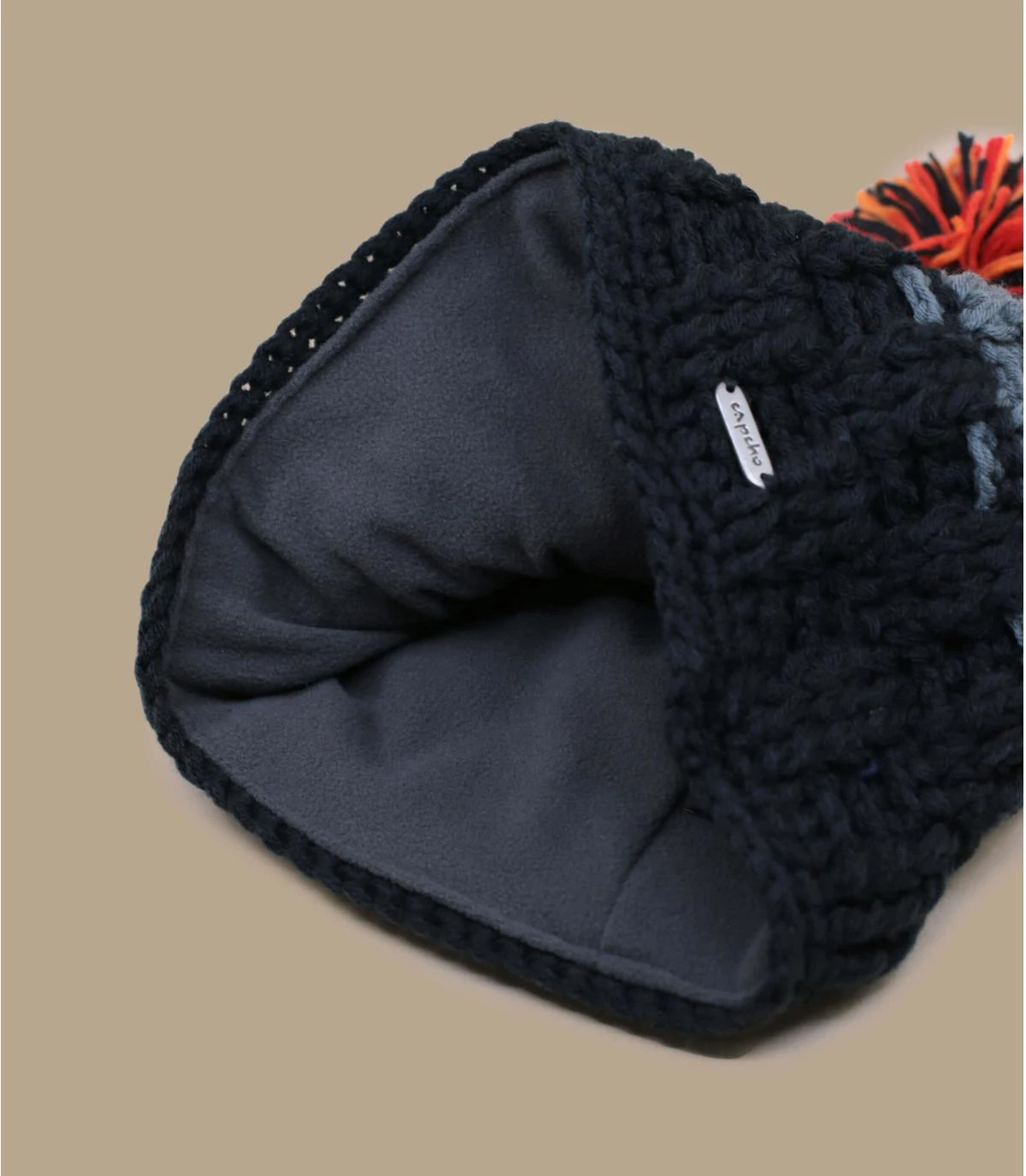 Fabriqué au Népal, ce bonnet à pompon orange vous donne de bonnes énergies avec ses couleurs orange et gris. Tricoté à la main, il est doublé en polaire au niveau des oreilles pour vous tenir chaud.