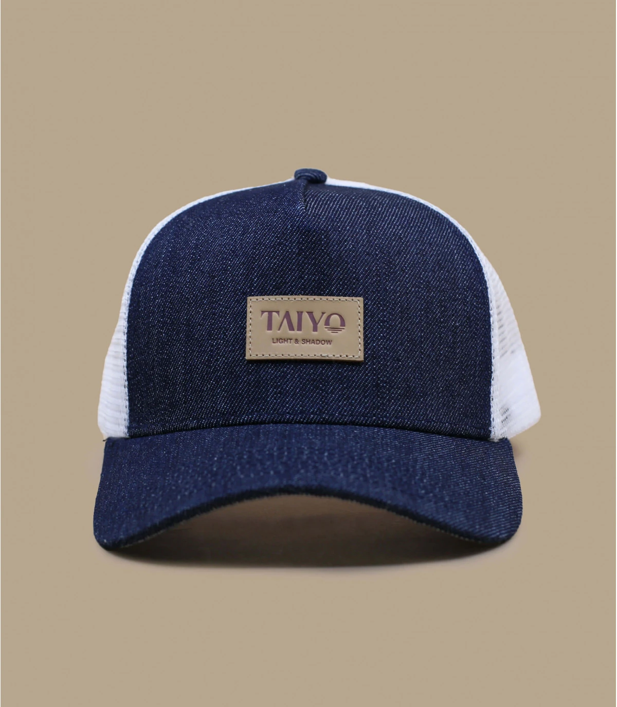 Un dessous de visière en denim inversé et un patch en simili cuir soignent les détails de cette trucker en denim de la nouvelle marque Taiyo spécialisée dans le headwear.