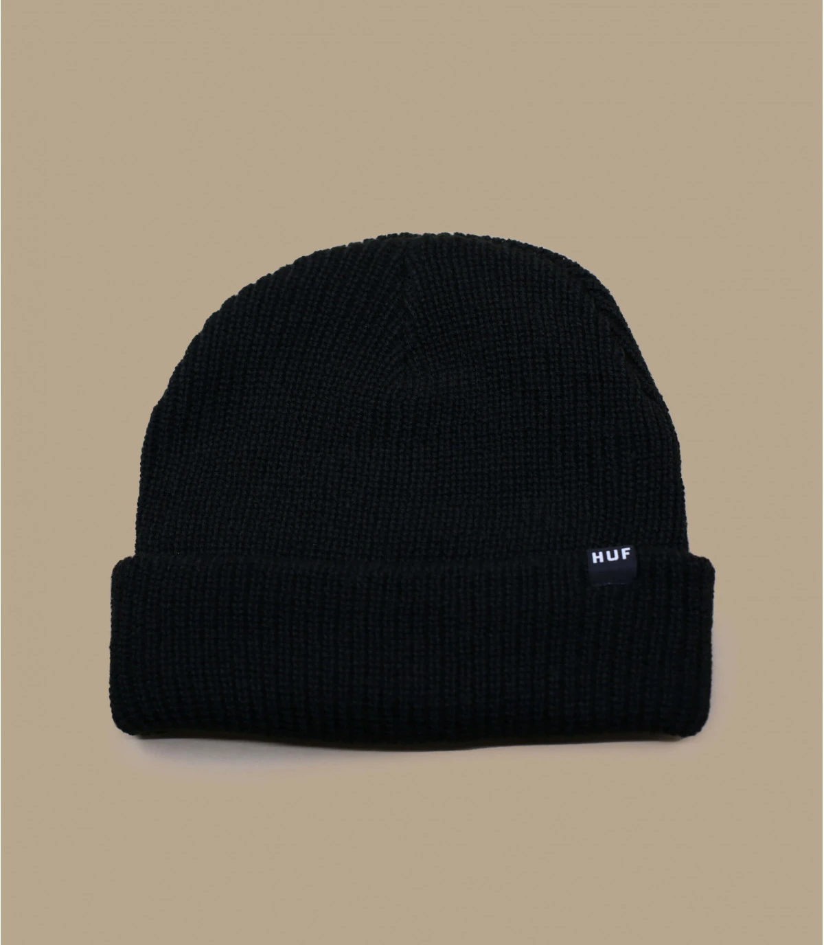 Bonnet Ă revers noir en acrylique avec un petit patch Huf cousu sur le revers.