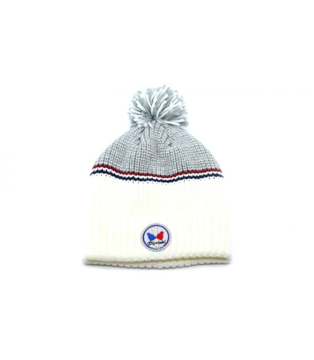 Issue de la collection vintage de la marque française Pipolaki, ce superbe bonnet blanc et gris est relevé d’une discrète rayure tricolore, assortie au logo de la marque qui décore le large revers. Un gros pompon couronne le tout.