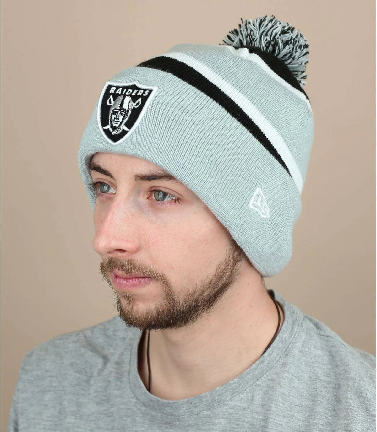 Vive l’hiver, c’est l’occasion de porter ce superbe bonnet gris Ă pompon, dĂ©corĂ© sur le revers de l’emblème de l’Ă©quipe de football amĂ©ricain des Las Vegas Raiders. Il est doux et tient bien en place.