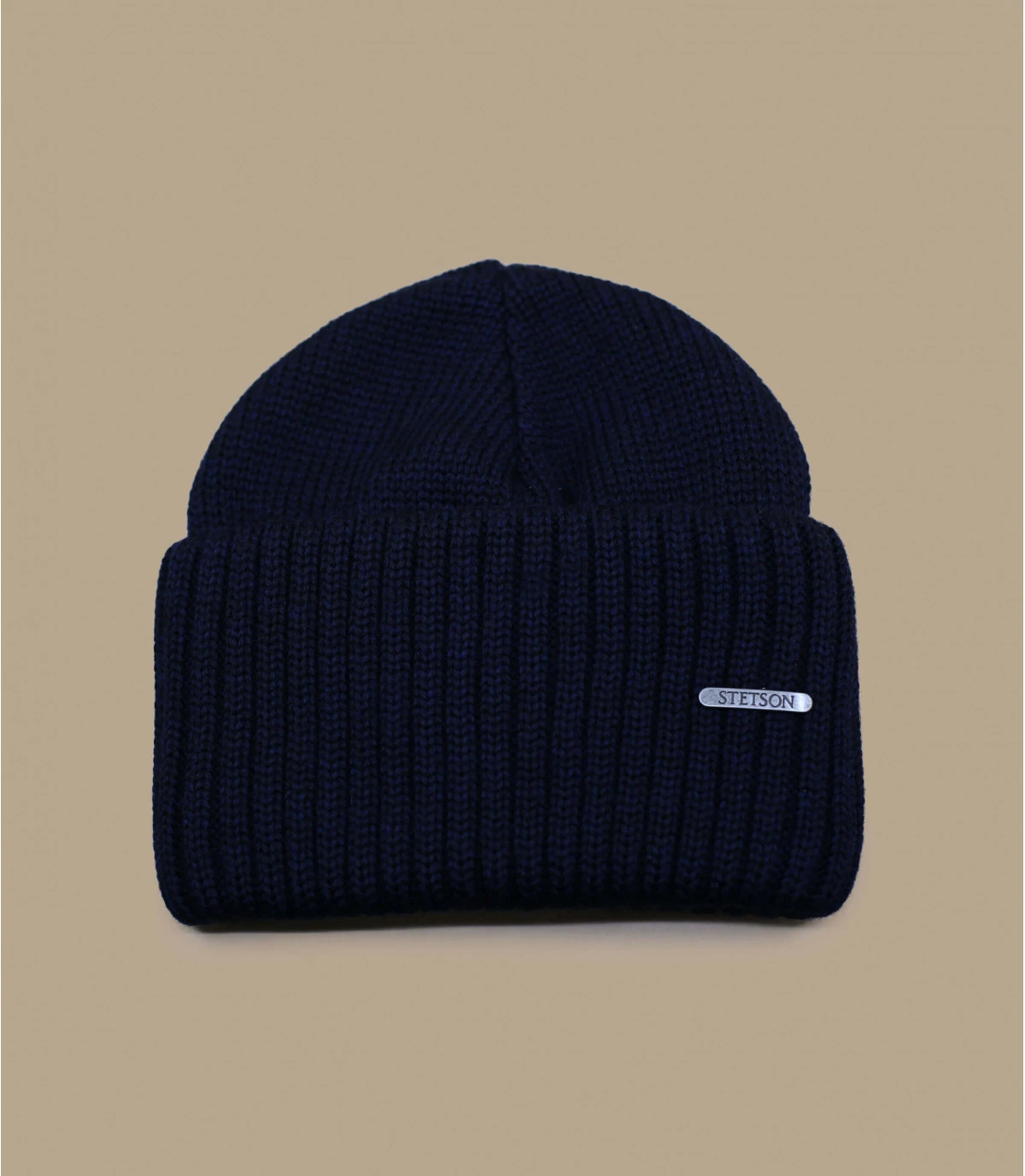 Bonnet Stetson bleu marine avec un large revers. Badge metal Stetson sur le côté.
