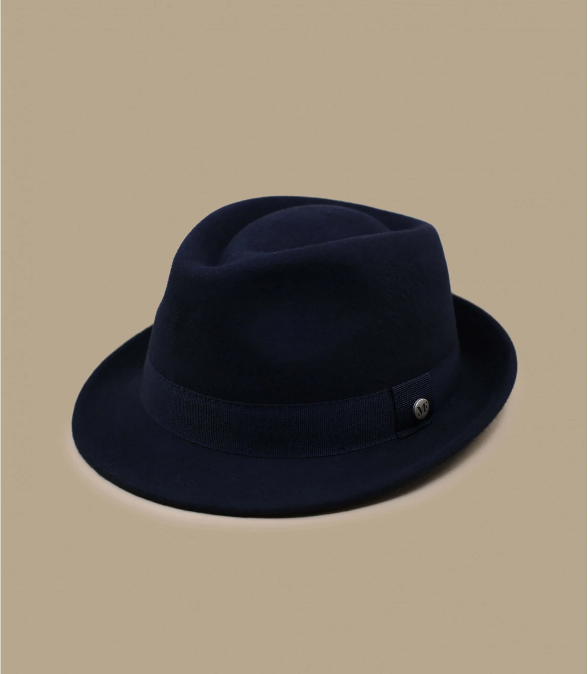 Couvrez-vous avec style cet hiver, en portant ce superbe chapeau trilby en feutre de laine dĂ©perlant de couleur bleu marine. RelevĂ© dâun galon ton sur ton et dâun petit pinâs en mĂ©tal, il est souple et doux, sa confection soignĂ©e est rĂ©alisĂ©e en Italie.