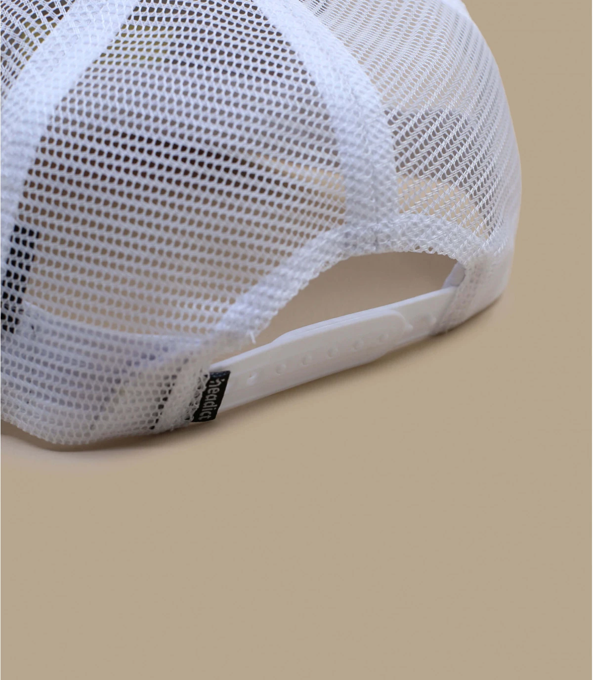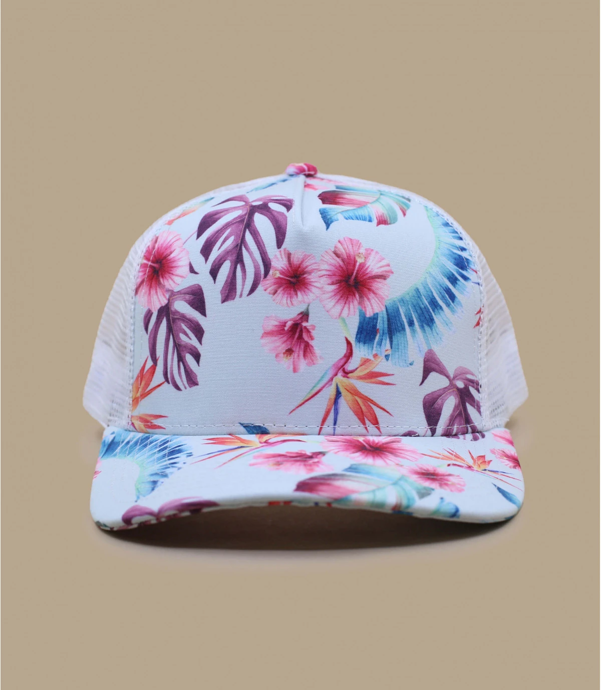 Trucker imprimĂ© floral devant et visière, filet blanc. Languette de rĂ©glage Ă l’arrière. Tour de tĂŞte 55 Ă 60 cm.