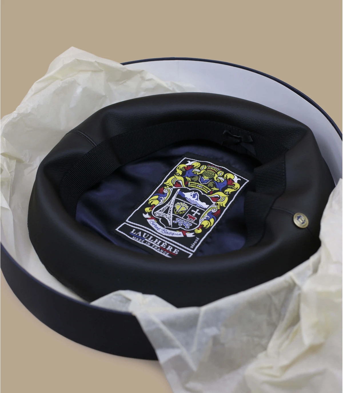 La maison LaulhĂšre sâengage pour une mode plus responsable. Ce bĂ©ret basque noir est en cuir vegan. On retrouve un blason ornĂ© de la maison LaulhĂšre Ă lâintĂ©rieur, le tour de tĂȘte est en gros grain satinĂ© et stretch.